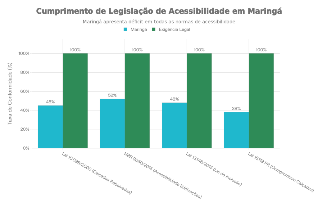Maringá cumpre apenas 38-52% da legislação federal de acessibilidade; Lei 15.119 (Paraná) tem maior deficit com 38% de conformidade