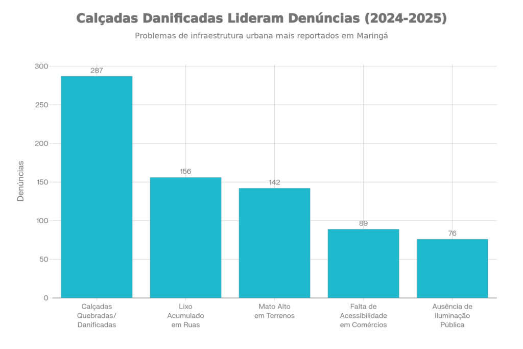 De 2024 a janeiro de 2026, Ouvidoria Municipal (156 Maringá) registrou 287 denúncias sobre calçadas quebradas ou danificadas. Não é “alguns pontos críticos” — é estrutura sistemática de negligência.