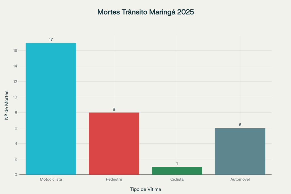 De janeiro a novembro de 2025, Maringá registrou mais de seis mil acidentes de trânsito. As estatísticas revelam que 17 das vítimas fatais eram motociclistas — sendo elas jovens em sua maioria, entre 20 e 29 anos. A Avenida Colombo lidera o ranking de acidentes, seguida pelas avenidas Brasil, Pedro Taques, São Paulo e Sincler Sambatti. Pedestres, ciclistas e ocupantes de automóveis também figuram nas tristes estatísticas, compondo um retrato de pluralidade das vítimas e agravando o desafio da gestão pública municipal.