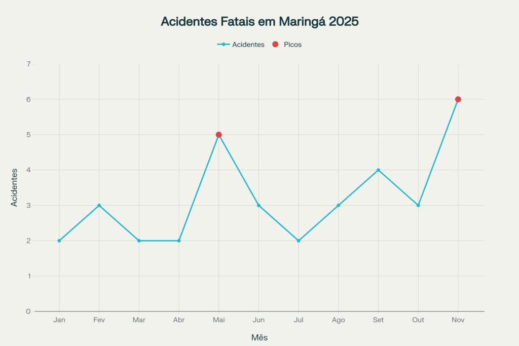 Ao analisar os meses do ano, observa-se que os acidentes fatais têm picos sazonais, com o mês de novembro especialmente crítico, sendo também maio e setembro períodos de atenção reforçada. Essa sazonalidade reflete, entre outros fatores, datas comemorativas, alterações climáticas e mudanças comportamentais da população, exigindo planejamento preventivo direcionado.