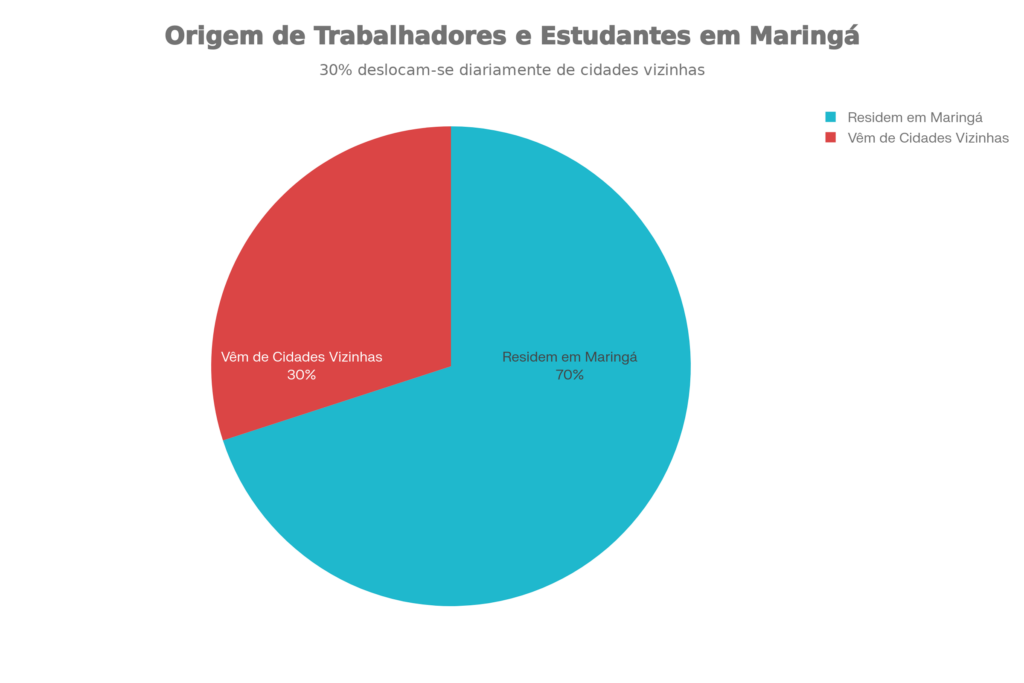 Distribuição de trabalhadores e estudantes em Maringá por local de origem, evidenciando que 30% vêm de municípios vizinhos e necessitam de mobilidade integrada e segura