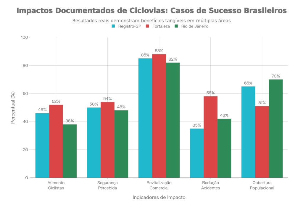 Comparação de resultados alcançados por cidades brasileiras que implementaram ciclovias e infraestrutura cicloviária, demonstrando aumento de usuários, melhoria de segurança e revitalização comercial