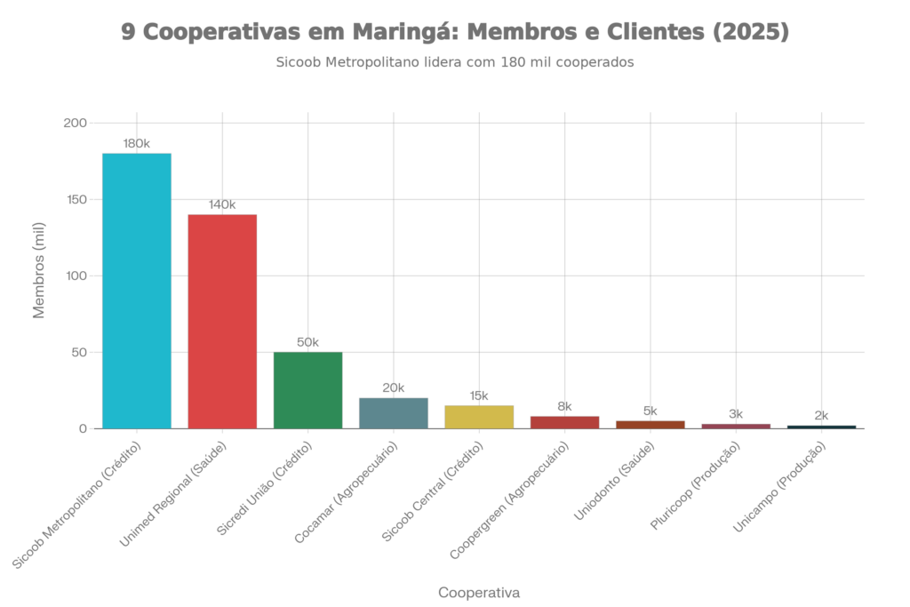 9 cooperativas em Maringá: Sicoob Metropolitano e Unimed Regional lideram em número de membros/clientes, com dados verificados