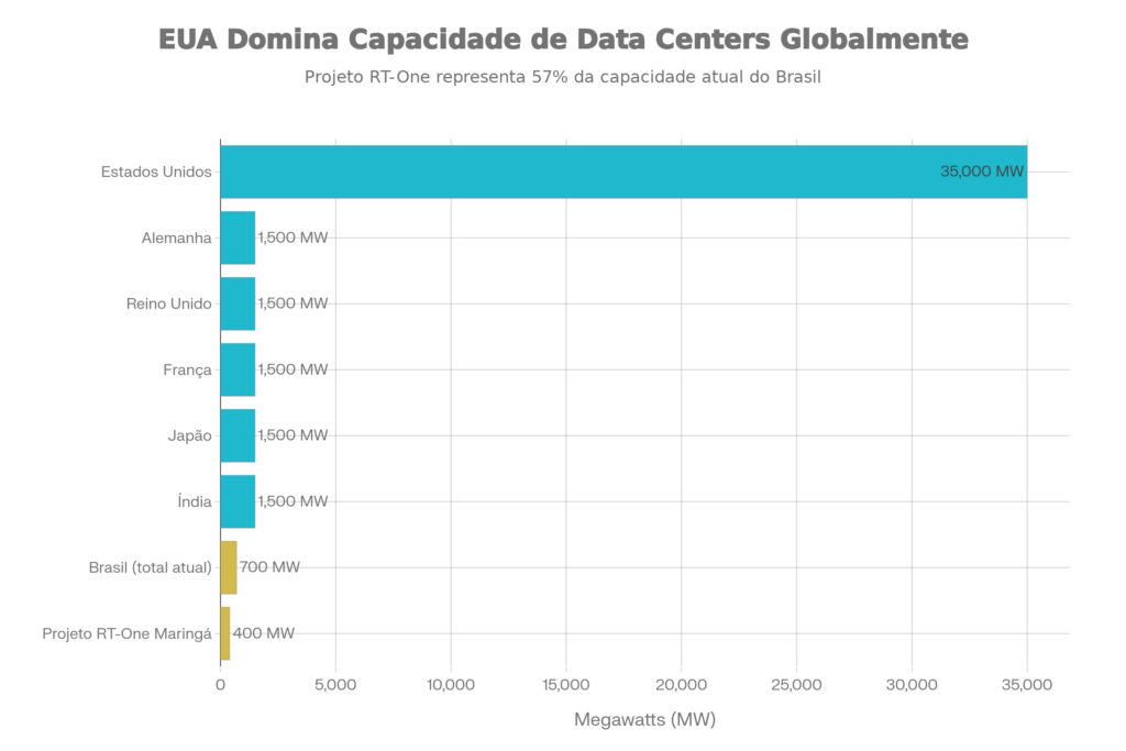 Capacidade instalada de data centers: Brasil está muito atrás dos líderes globais, mas o projeto em Maringá representa avanço estratégico