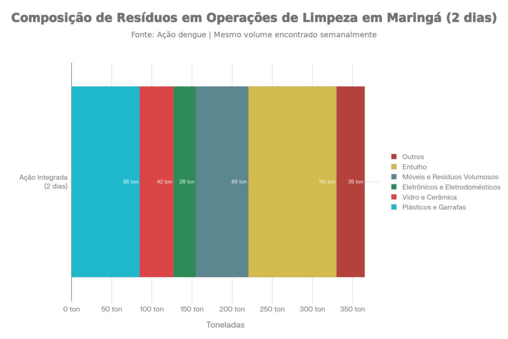 A Prefeitura de Maringá oferece canais para denúncias, como o aplicativo Ouvidoria 156 Maringá, telefone 156 e WhatsApp, além do agendamento de coleta de inservíveis e pontos de descarte correto espalhados pela cidade. Em 2025, ações integradas recolheram mais de 365 toneladas de resíduos em apenas dois dias de mutirão contra a dengue, mostrando o impacto direto do descarte irregular na saúde pública.