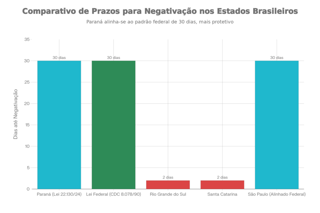 NOTA IMPORTANTE: A proposta de redução do prazo foi REJEITADA em 25 de março de 2025 pela Assembleia Legislativa do Paraná com votação de 44 votos contra e apenas 1 a favor. Lei 22.130/24 permanece em vigor com proteções intactas, mantendo o prazo de 30 dias para negativação, conforme notícia oficial da ACP.