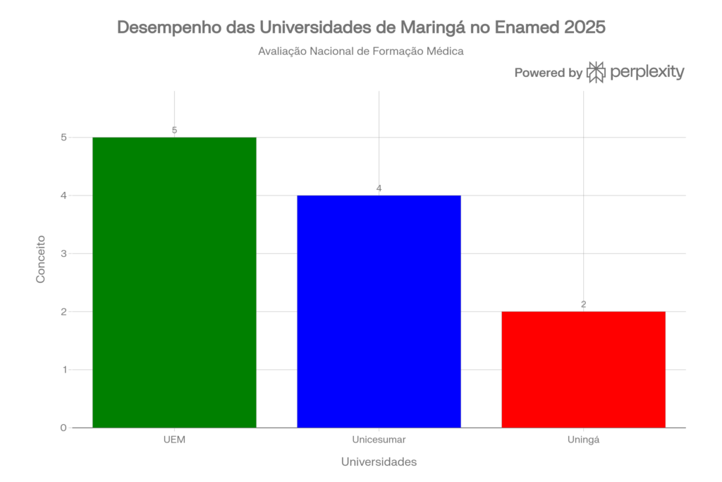 A Uningá, contudo, recebeu conceito 2 — a segunda pior classificação na escala. Isso não é um detalhe. Significa que a instituição figura entre os 107 cursos de medicina no Brasil considerados de “baixo desempenho” pelo MEC. Dos 351 cursos avaliados, 83 ficaram com conceito 2, e 24 com conceito 1. A Uningá está nesse grupo preocupante. E, importante lembrar, essa instituição possui hospital próprio e unidade básica de saúde, estruturas que estão conectadas diretamente ao Sistema Único de Saúde (SUS) e ao atendimento à população maringaense.