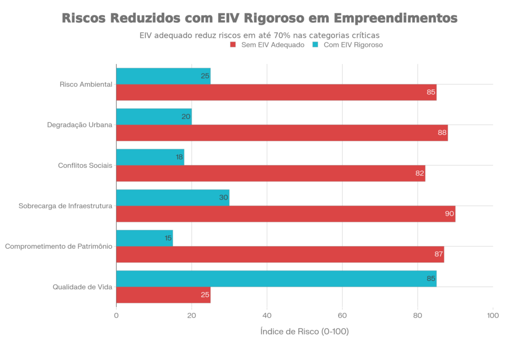 Comparação entre empreendimentos analisados com Estudo de Impacto de Vizinhança adequado versus aqueles realizados sem EIV ou com análise inadequada, demonstrando redução de riscos ambientais e urbanos