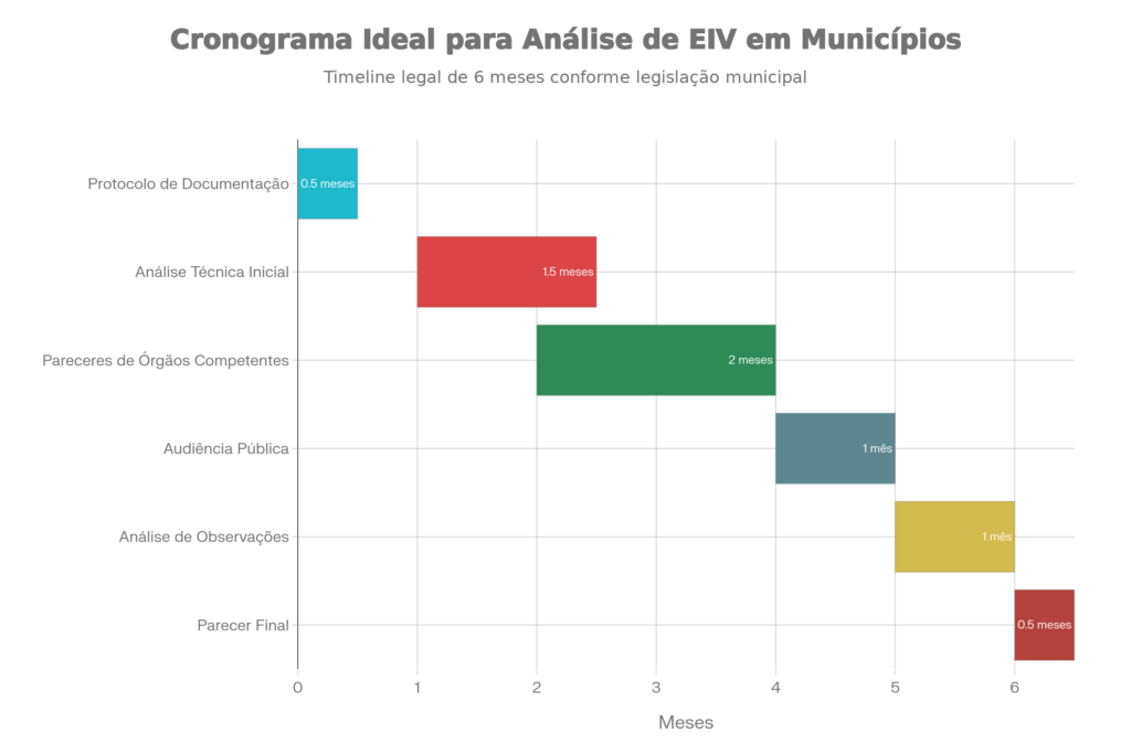 Timeline padrão para análise de Estudo de Impacto de Vizinhança conforme legislação municipal, demonstrando que 6 meses é prazo adequado e viável para conclusão completa