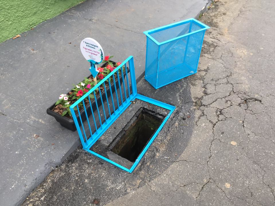 Sistema de tela removível azul instalado para bloquear detritos em bueiro de rua em Blumenau