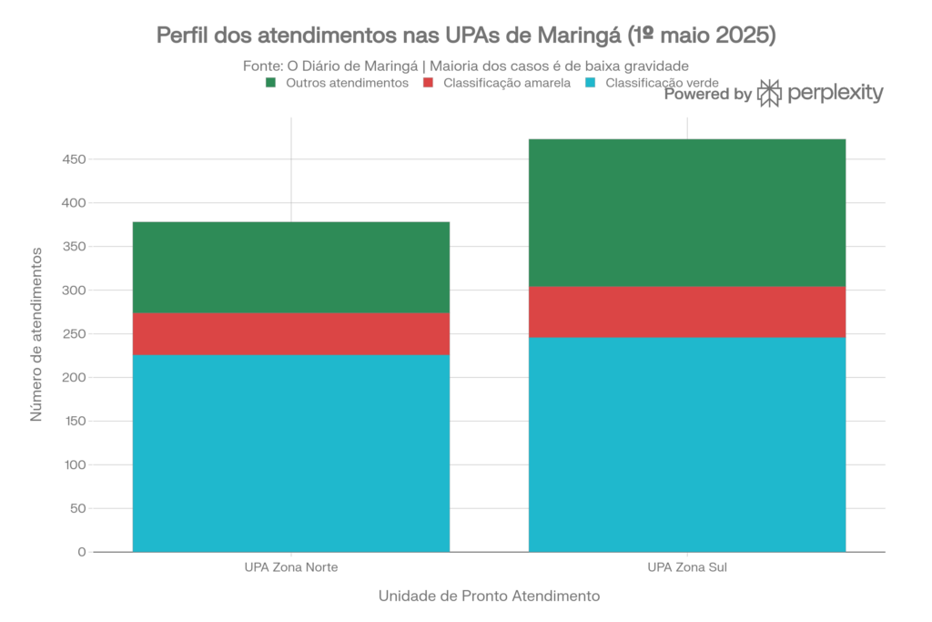 Um levantamento jornalístico no feriado de 1º de maio de 2025 ilustra bem essa distorção. Somando UPA Zona Norte e UPA Zona Sul, foram 851 atendimentos em um único dia. Desse total, mais da metade era de casos classificados como verde – pouco urgentes – segundo o protocolo de triagem. Na Zona Norte, 59,8% dos atendimentos eram de baixa gravidade; na Zona Sul, 52%.
