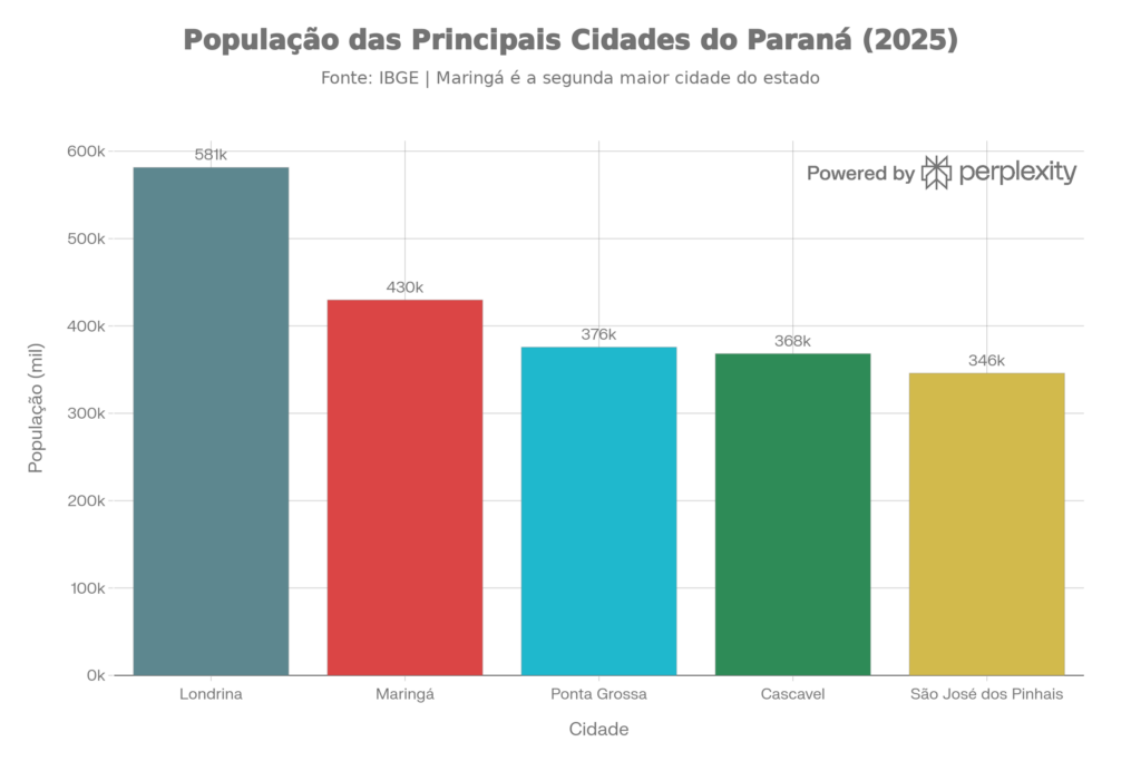 Maringá tem cerca de 429.660 habitantes em 2025, de acordo com dados do IBGE, similar a Londrina (581.382), Cascavel (368.195) e São José dos Pinhais (345.880).