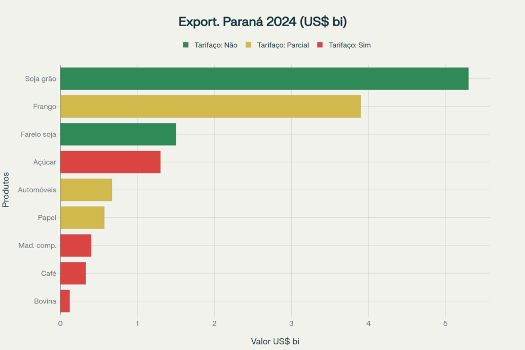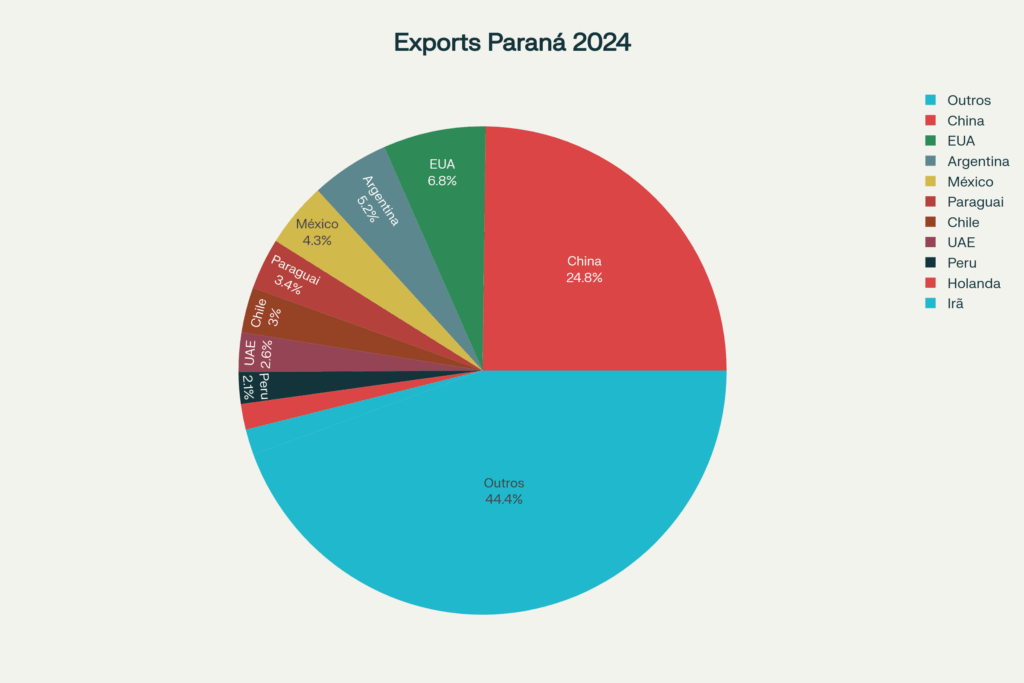 Os números mostram que essa diversificação já está em curso: a China absorve 24,8% das exportações paranaenses (US$ 5,8 bilhões), quatro vezes mais que os EUA. Argentina (5,2%), México (4,3%) e outros mercados emergentes oferecem alternativas concretas.