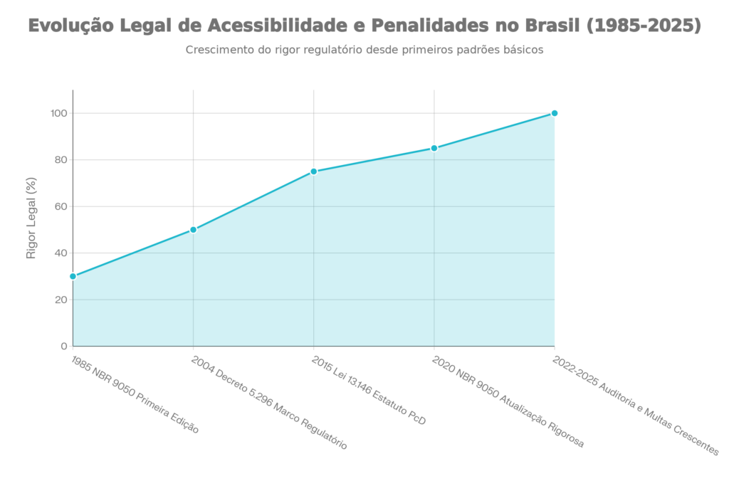 Legislação de acessibilidade aumentou rigor: 1985 norma básica, 2015 Lei 13.146 com penalidades, 2020 NBR atualizada, 2022-2025 multas até R$ 16 mil + penas criminais