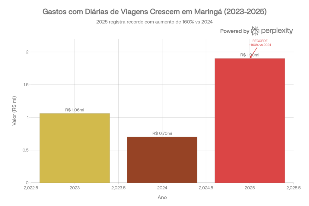 Portal da Transparência revela o número: a Prefeitura e a Câmara de Maringá gastaram R$ 1.809.805,42 em diárias para viagens em 2025. Somando a Câmara (R$ 91.445), chegamos a aproximadamente R$ 1,9 milhão para deslocamentos de agentes públicos.