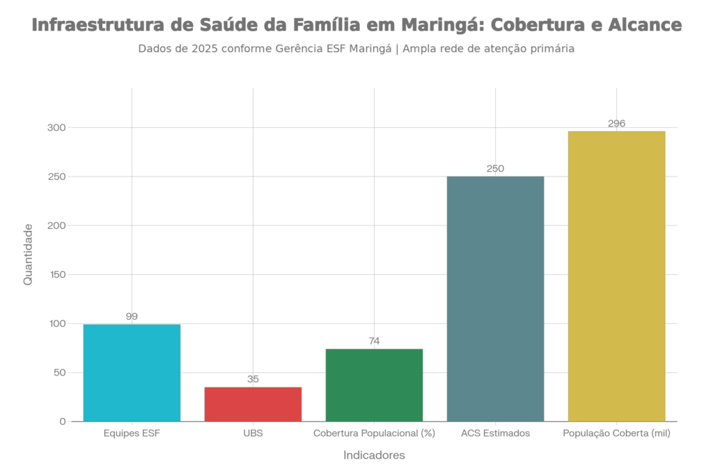 Infraestrutura da Estratégia Saúde da Família em Maringá, mostrando número de equipes, unidades, cobertura populacional e alcance aproximado de população assistida