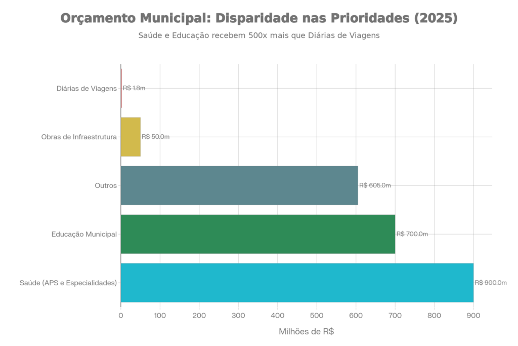 Comparação de alocação orçamentária de Maringá em 2025, destacando despesas com diárias de viagens versus investimentos em saúde, educação e infraestrutura urbana
