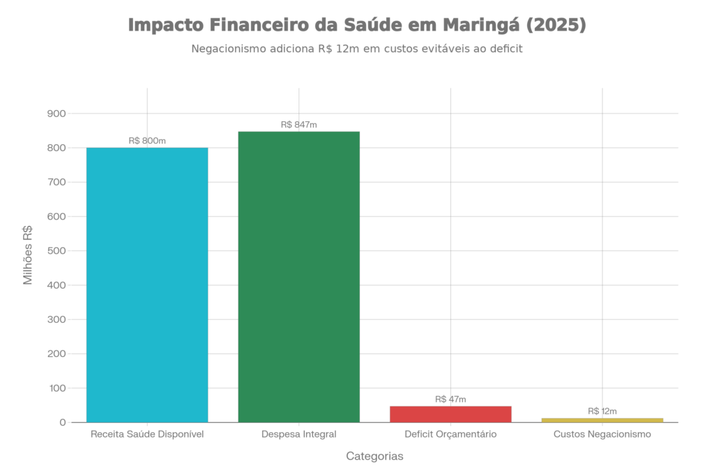 Análise orçamentária da saúde em Maringá, mostrando deficit de R$ 47 milhões e custos adicionais causados por negacionismo e desinformação