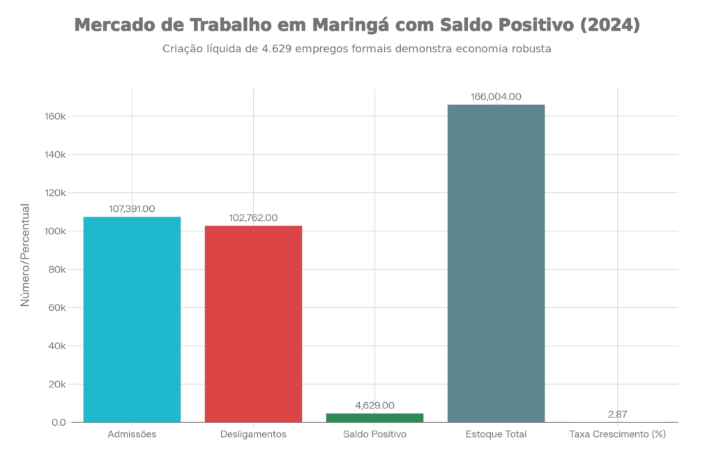 Maringá encerrou 2024 com saldo positivo de 4.629 vagas formais, resultado de 107.391 admissões e 102.762 desligamentos, um crescimento de 2,87% no estoque de empregos formais, que chegou a 166.004 vínculos ativos. Esses números colocam Maringá entre as cidades líderes em geração de empregos no Paraná, atrás apenas de grandes polos como Curitiba e Londrina.