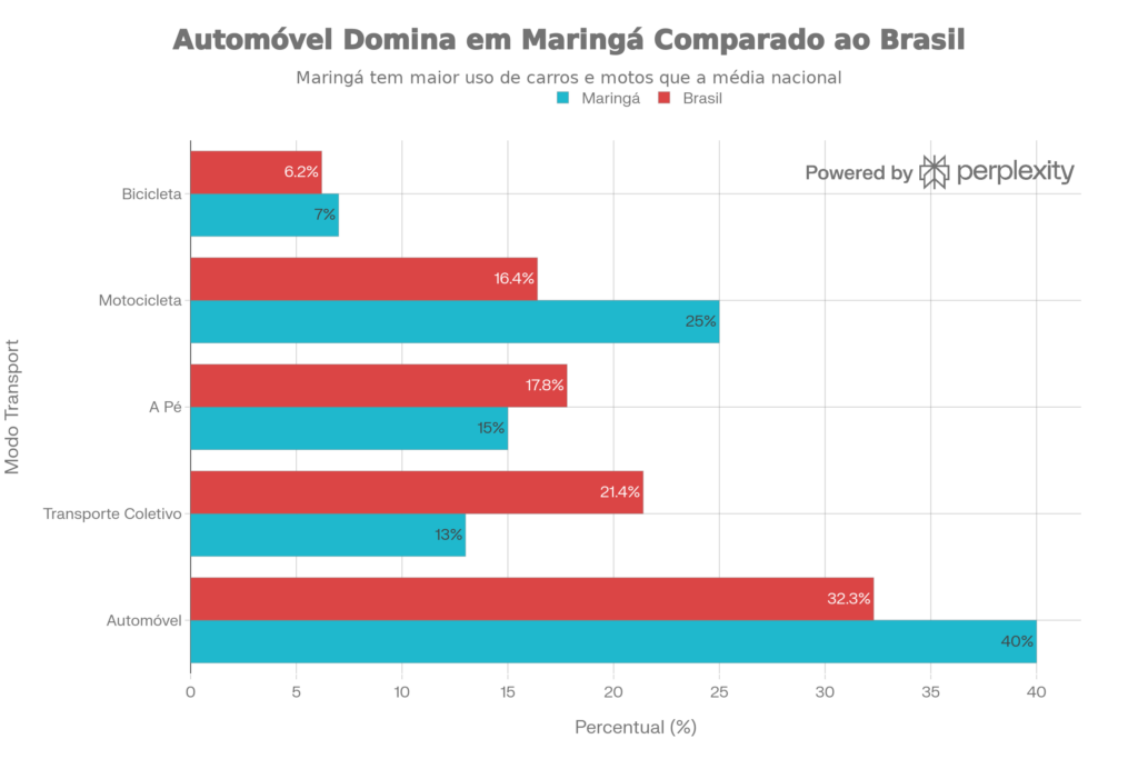 Aqui mora um dos pontos mais preocupantes da nossa mobilidade urbana. Maringá registra um dos menores índices de uso de transporte coletivo entre as grandes cidades paranaenses: apenas 13% dos trabalhadores vão de ônibus ao emprego, contra 17% da média estadual. O dado é alarmante porque revela uma migração silenciosa — e perigosa — para o transporte individual motorizado.
