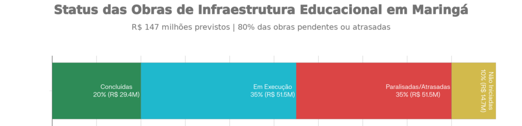 Em 2024, Prefeitura anunciou programa ambicioso: R$ 147 milhões em obras de infraestrutura educacional. Novos CMEIs, reformas estruturais, cobertura de áreas, sistemas hidráulicos e elétricos renovados.