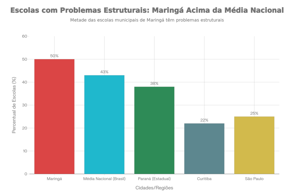 Metade das escolas municipais de Maringá possui problemas estruturais; taxa é superior à média nacional (43%) e significativamente maior que Curitiba (22%)